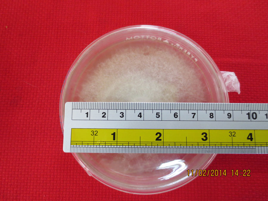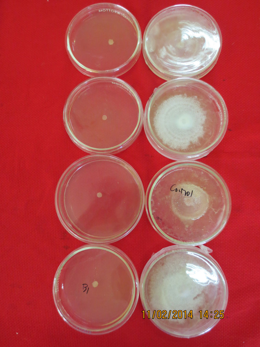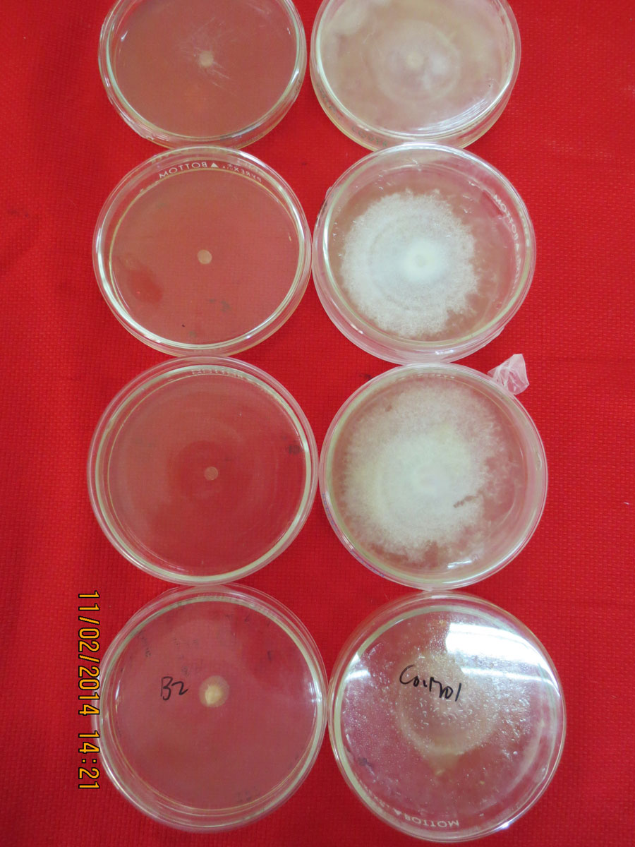 Table 1 shows the average growth of Bioafe 1 and 2 compare to the positive control or pure Foc isolate. As shown in Table 1 no growth of Foc was observed in Biosafe 1 as compare to Biosafe 2 which has an average of 10 mm. This means that, Biosafe 1 can inhibit the growth of Foc in the laboratory at 75 ml/liter. Using Biosafe 2, there was growth of Foc at 75ml/ liter.